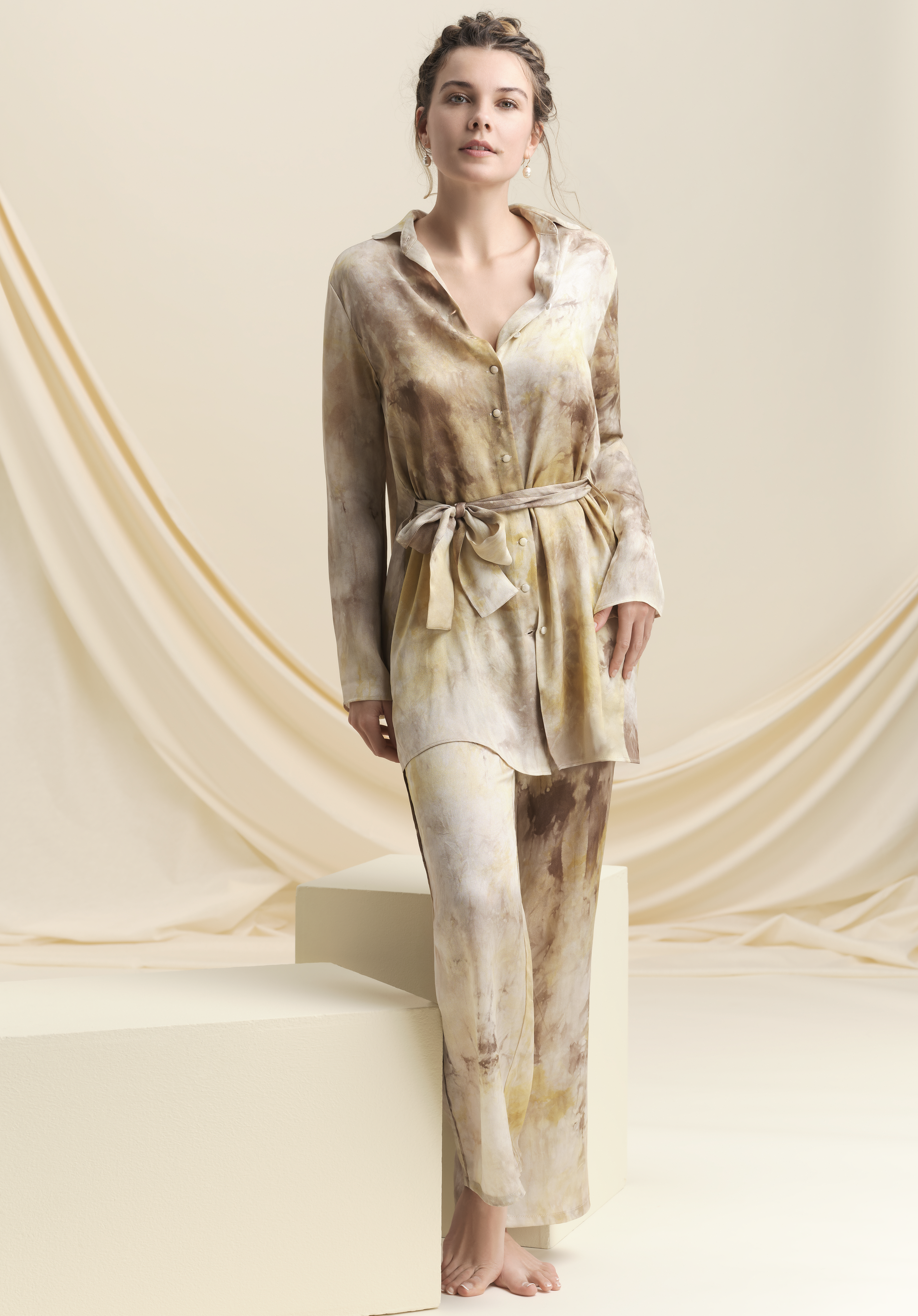Crafted from silk batik from the Haute Couture workshops of Lyon, the Élévation straight-leg pants combine comfort and elegance. Their straight cut, highlighted by a refined side braid and practical pockets, flatters the figure with distinction. Easy to wear for any occasion—at home, by the sea, or dressed up with the Légèreté blouse dress—they adapt to your style, from the most casual to the most sophisticated. Its mineral shades in 4 colors evoke the raw beauty of nature and the preciousness of fine stones.